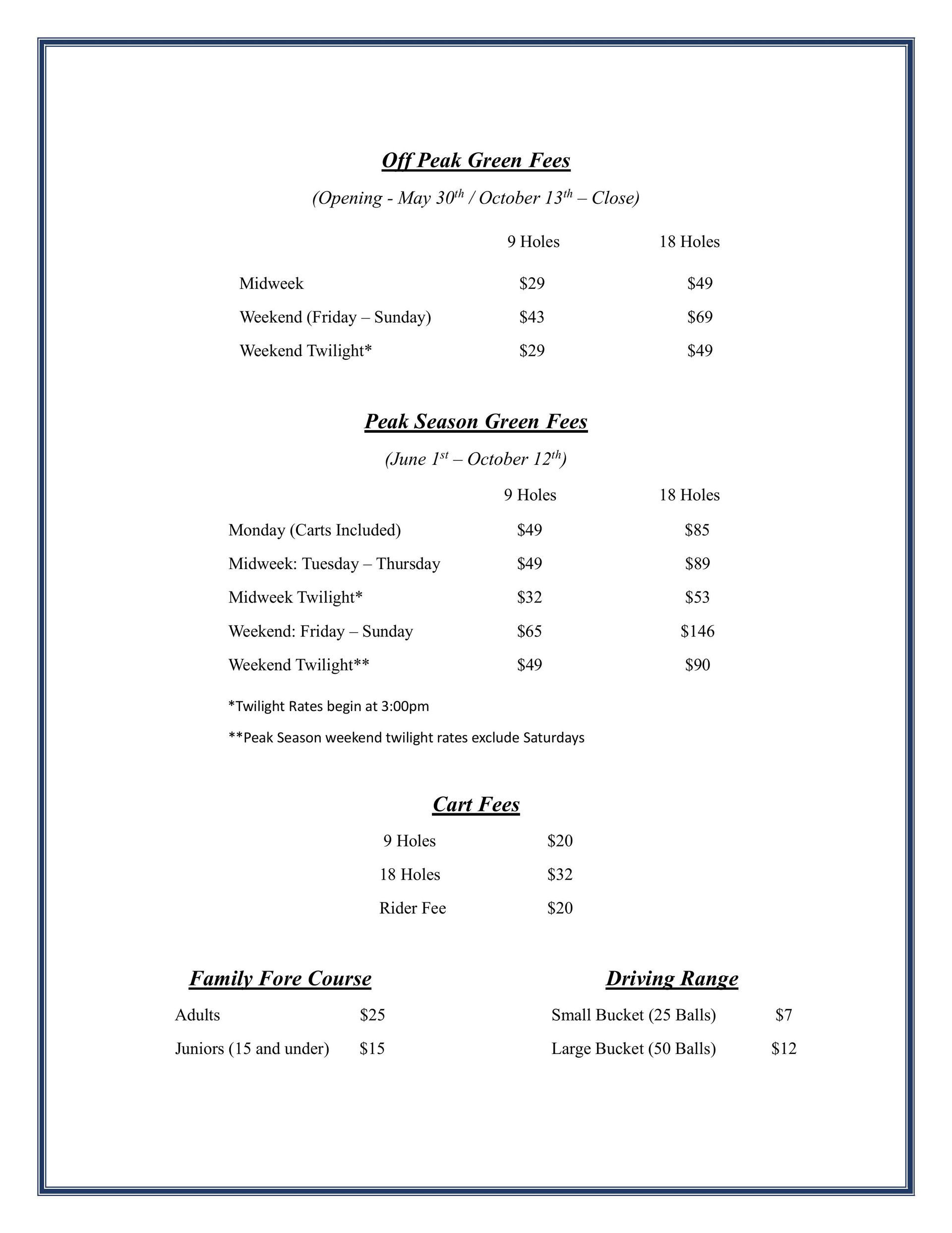 - Tee times Sunday-Thursday after 2:00pm